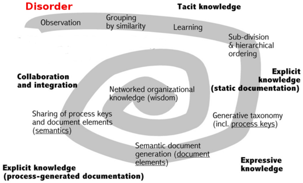 The first step in the Knowledge Swirl, disorder invokes an evolutionary rawness; it is very Old Testament. Unfortunately, much of the world is in chaos, it is disordered, even when there is no need. Think, for example, of when you needed to install or assemble some kind of technical apparatus. The instructions were possibly written by someone that doesn't understand your language or who wrote to a different, more technical audience. Perhaps the materials simply hadn't been updated recently. You were in the dark, but that doesn't mean that answers didn't exist. They were simply not available to you.